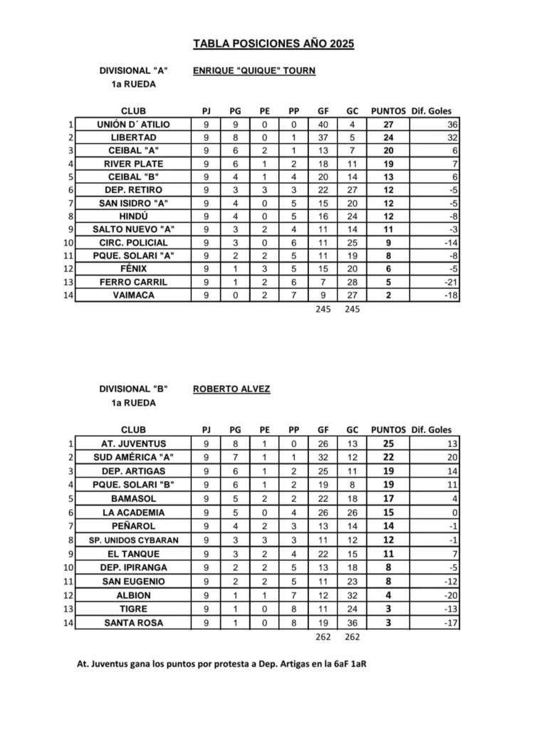 En la Divisional «B», en tanto, Juventus asume el control con sus 25 puntos acumulados, superando en tres a Sud América, mientras Deportivo Artigas observa 19.
