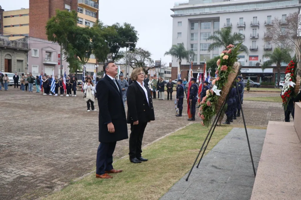 Acto protocolar en plaza Artigas en conmemoración del 195 aniversario de la jura de la 1ra Constitución de la República Oriental del Uruguay. Se contó con la presencia de las autoridades municipales, y la presencia del intendente de Salto, el Dr. Carlos Albisu y la Directora de Gestión Administrativa, la Esc. Mirna Haller.