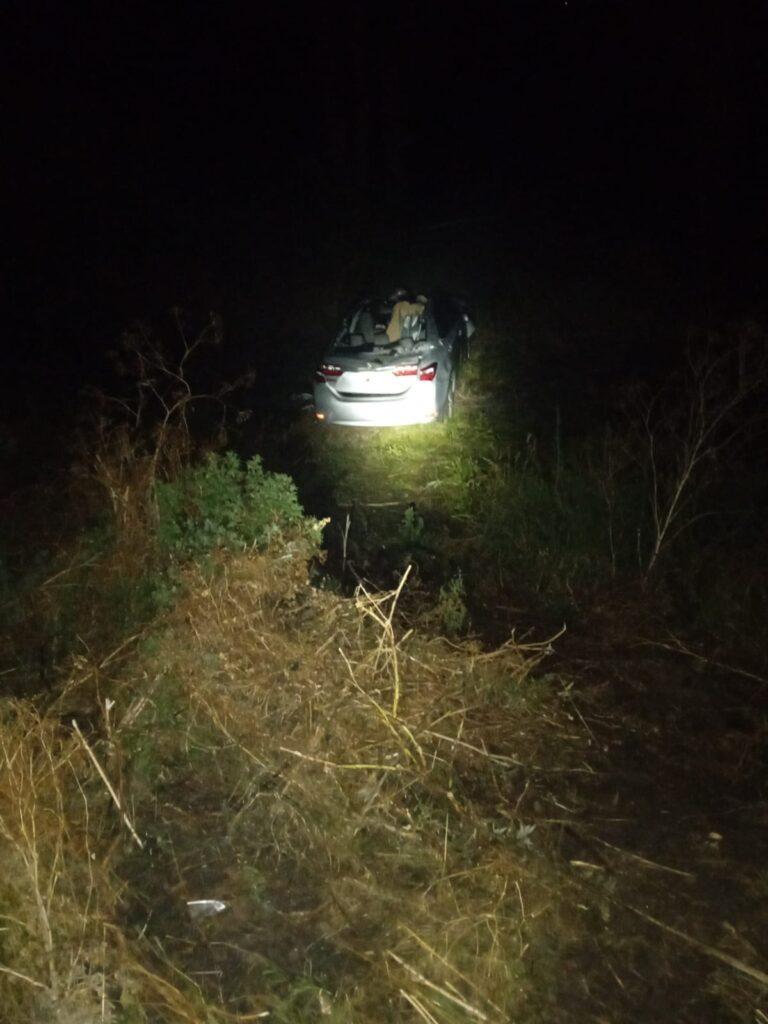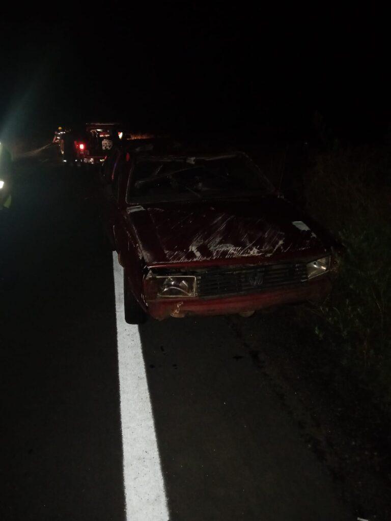 En el lugar se pudo verificar que un vehículo marca Toyota, matricula Argentina se encontraba sobre la banquina en su posición final(Oeste a Este) con daños en techo y frente del mismo. En dicho vehículo viajaban, el conductor, un masculino mayor de.edad, de nacionalidad Argentina quien fue diagnosticado «politraumtismo grave», siendo trasladado al HRS. Llevaba como acompañante a una femenina de 61 años de edad, de nacionalidad Argentina cuyo fallecimiento fue constatado en el lugar. Dicho vehículo que circulaba de Norte a Sur habría embestido equinos que se encontraban sobre la ruta y que pertenecerían a una tropilla.