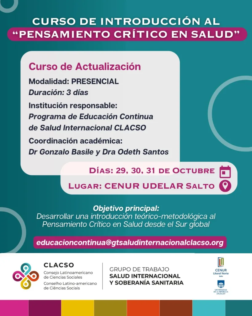 Modalidad y certificación. Programa de certificación de Curso de Actualización, con 4 sesiones presenciales en 3 días. Organizan el Programa de Educación Continua de Salud Internacional (CLACSO), el Grupo de Trabajo Salud Internacional y Soberanía Sanitaria de CLACSO y la sede Salto del Cenur Litoral Norte (Udelar).