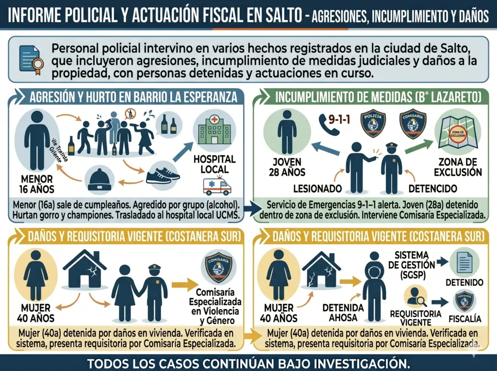 Personal policial intervino en varios hechos registrados en la ciudad de Salto, que incluyeron agresiones, incumplimiento de medidas judiciales y daños a la propiedad, con personas detenidas y actuaciones en curso.