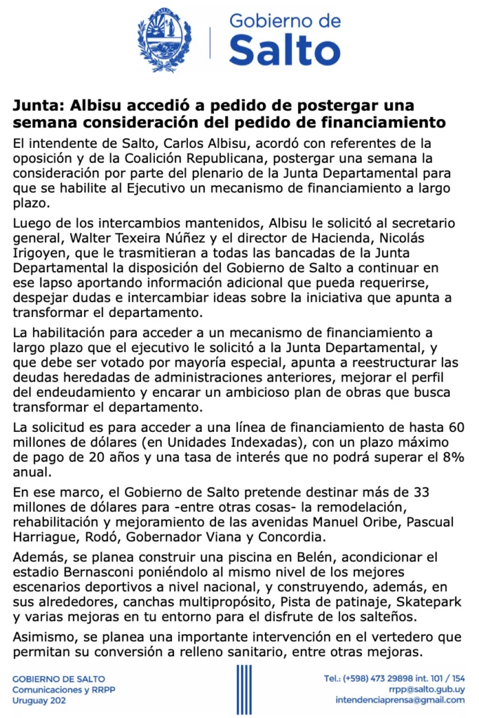 De acuerdo a lo informado por la Intendencia, el jefe comunal encomendó al secretario general, Walter Texeira Núñez, y al director de Hacienda, Nicolás Irigoyen, comunicar formalmente a todas las bancadas la disposición del Gobierno de Salto para continuar aportando información, aclarar dudas y generar un intercambio más profundo antes de la votación.