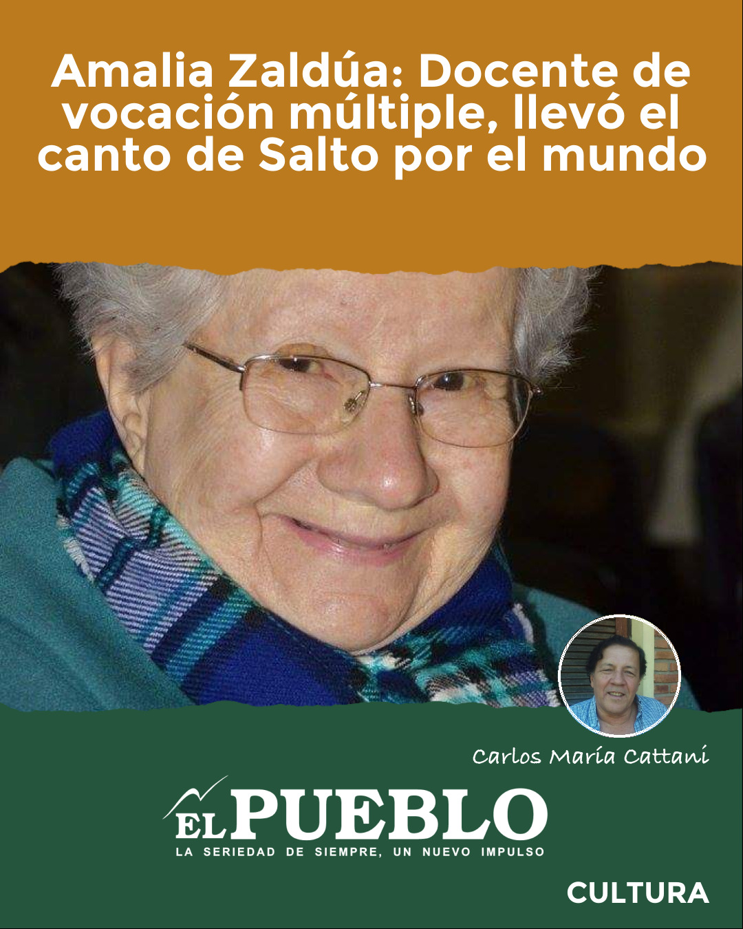 Docente, directora coral y escritora, Amalia Zaldúa Rivas es una de las figuras culturales más profundas y fecundas de Salto. Su vida, atravesada por la educación, la música y la palabra, deja una huella silenciosa pero perdurable en generaciones enteras. Hoy sigue escribiendo y palpitando con el acontecer cultural local.