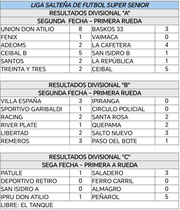 Para la Liga Súper Sçenior, fue la del pasado domingo, la segunda fecha de la primera rueda, con un resultado que no pasa de largo, desde el momento que Unión Don Atilio llegó a 8 goles. Es después de todo, su prolongada tendencia al gol. Los dos Ceibal que juegan llegaron a la lotería en cada caso. Un aspecto a consignar: no hubo empates en la Divisional «A». En la «B» y en la «C» igualmente la segunda fecha, mientras El Tanque fue quien dispuso de fecha libre.