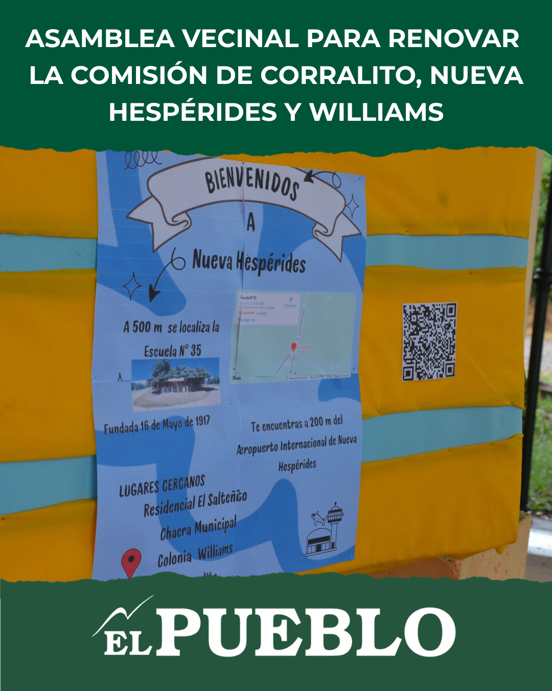 La Coordinación Barrial del Gobierno de Salto confirmó que la Comisión Vecinal de Corralito, Nueva Hespérides y Williams realizará una asamblea abierta para renovar autoridades para el período 2025–2027.