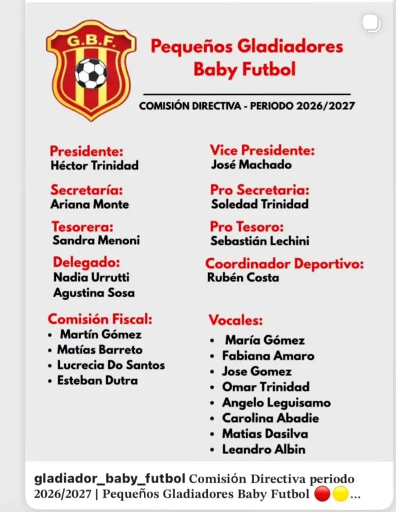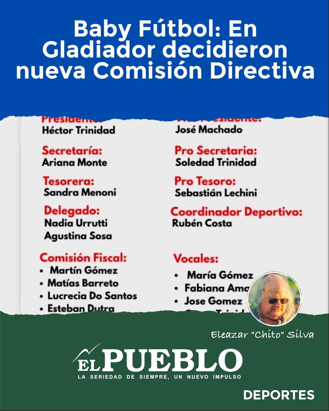 Desde la Comisión Directiva de Gladiador a EL PUEBLO, la información puntual con respecto a quienes la integran con la mira puesta en el próximo ejercicio. Es del caso tener en cuenta el significativo número de quienes la compone, , con cuatro en la Comisión Fiscal a manera de ejemplo y vocales que faltan en el listado.