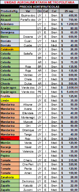 Jueves, 25 de Setiembre del 2025: La jornada se desarrolló de forma similar al inicio de la semana, manteniéndose la menor afluencia de compradores y el enlentecimiento en la colocación de mercadería. Según comentarios de informantes calificados, se observó un cambio en el consumo asociado al descenso de las temperaturas, lo que generó un renovado interés en las hortalizas secas. Con respecto al último relevamiento de precios, se registraron descensos en los valores de tomates Redondo y Cherry, morrón Rojo, cebolla temprana, zucchini, zapallito, pepino, berenjena, coliflor, brócoli, albahaca, choclo, ciboulette, espinaca, puerro, rabanito, remolacha, rúcula, arveja y frutilla. Por otro lado, se observaron aumentos en los precios de morrón Amarillo y verde, tomaterita Perita, manzana, arándano, perejil y ajíes catalanes. Como novedad se registro el ingreso de las primeras partidas de la variedad Orri y Montenegrina en la oferta de mandarinas.