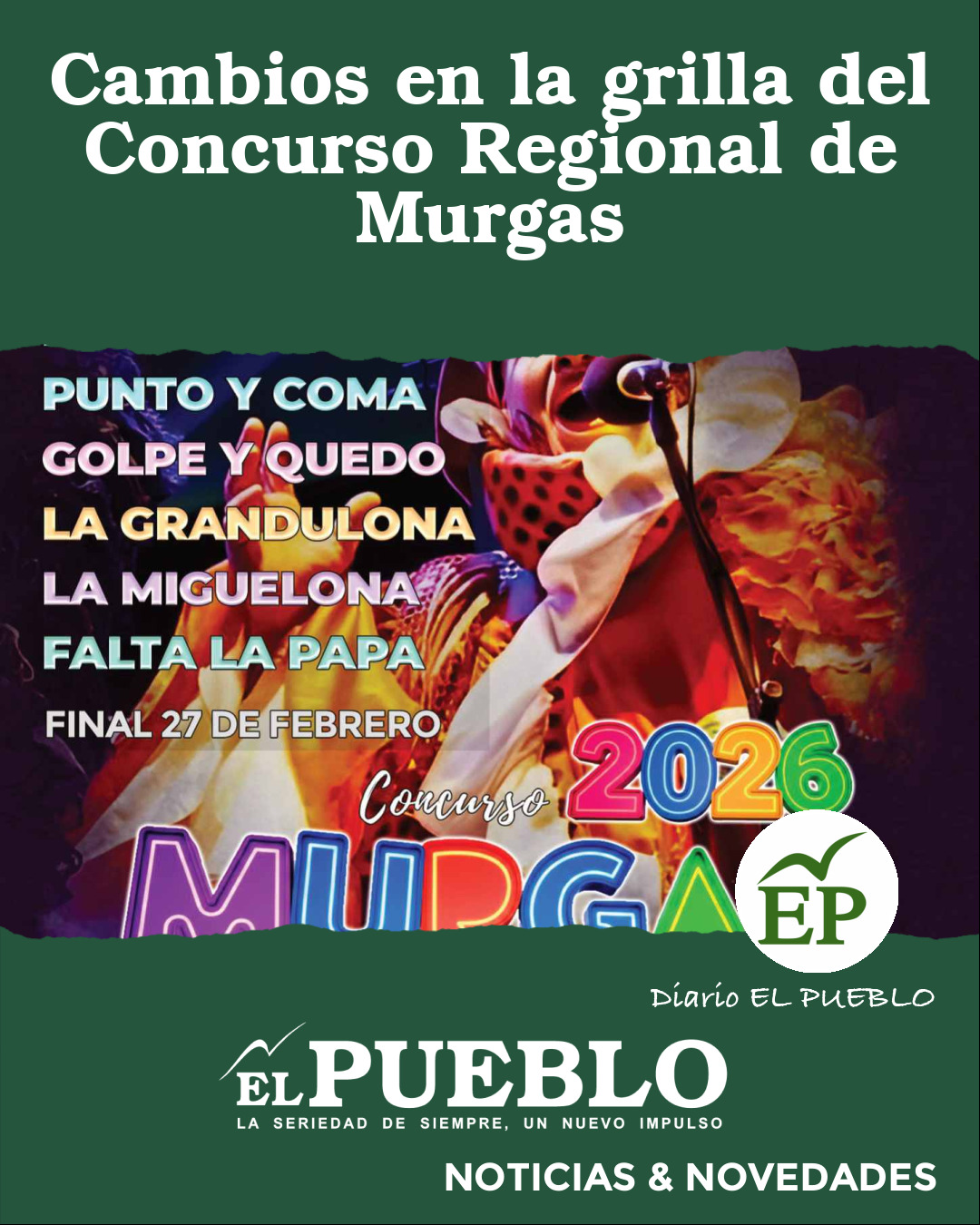 La Comisión Directiva de ASAC informó que, por razones de fuerza mayor, la murga La Farola no participará del certamen, lo que obligó a modificar la programación prevista para la primera noche regional del Concurso de Murgas.