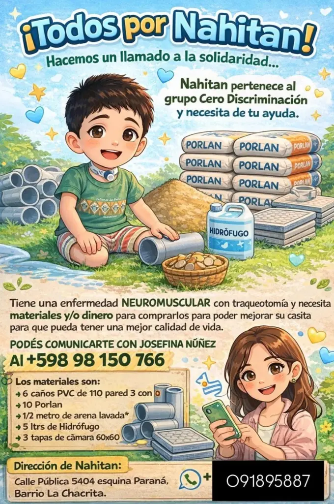 La Asociación Cero Discriminación lanzó la campaña solidaria “Todos por Nahitan”, una iniciativa que busca reunir materiales de construcción y apoyo económico para mejorar las condiciones de accesibilidad y saneamiento en la vivienda de un niño con discapacidad que vive junto a su familia en barrio La Chacrita.