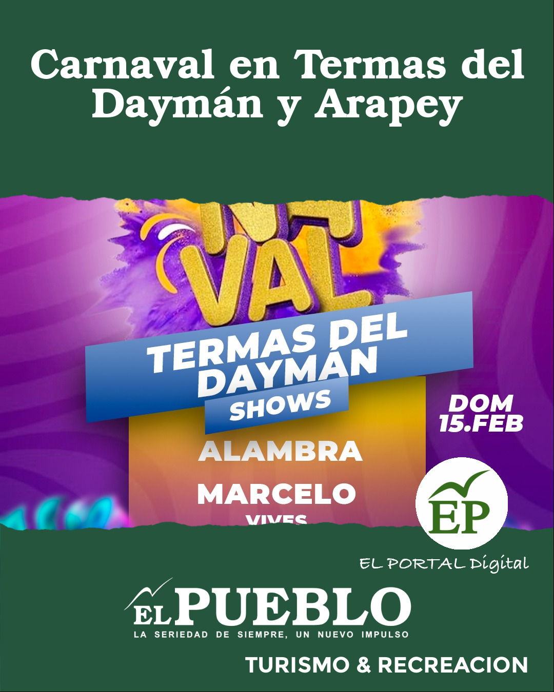 En Termas del Daymán, el escenario estará ubicado en el estacionamiento lindero al río, en las afueras del parque termal. La actividad se desarrollará el domingo 15 de febrero, desde las 20 horas, con las actuaciones en vivo de Marcelo Vives, La del 30, Alambra y el cierre a cargo de Wanco.