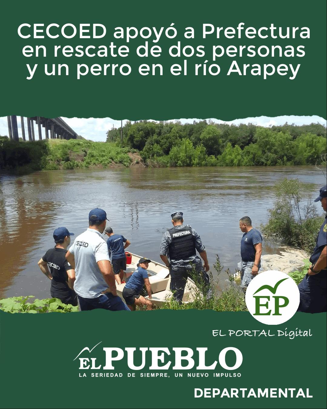 El Centro Coordinador de Emergencias Departamentales (CECOED) brindó apoyo a Prefectura de Salto en un operativo de rescate de dos personas y un perro que se encontraban varados en la zona de Paso