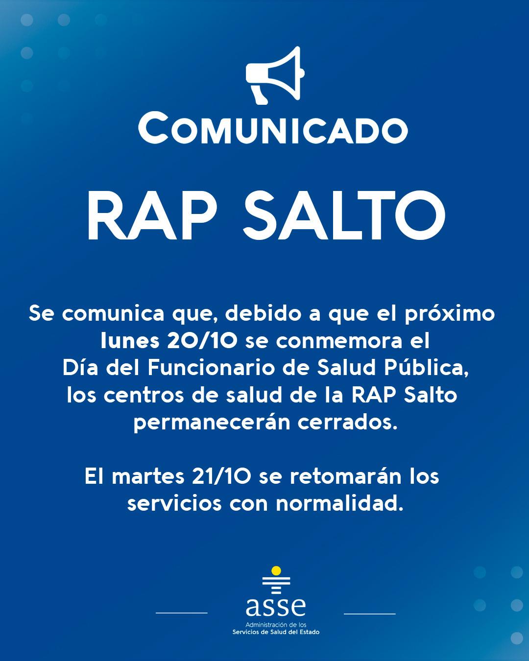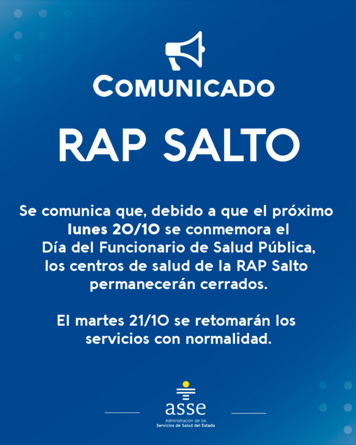 Se comunica que, debido a que el próximo lunes 10 de octubre, se conmemora el Día del Funcionario de Salud Pública, los centros de salud de la RAP Salto permanecerán cerrados. El martes 11 de octubre se retomarán los servicios con normalidad.