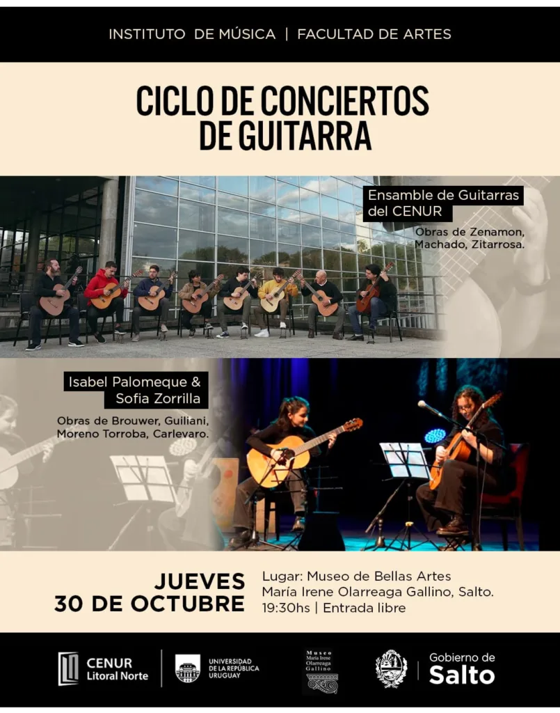 El próximo jueves 30 de octubre, el Museo de Bellas Artes María Irene Olarreaga Gallino de Salto será el escenario de una nueva edición del Ciclo de Conciertos de Guitarra, organizado por el Instituto de Música de la Facultad de Artes de la Universidad de la República, con el apoyo del Gobierno Departamental de Salto.