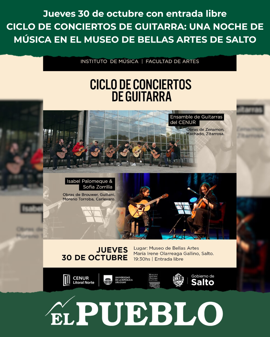 El próximo jueves 30 de octubre, el Museo de Bellas Artes María Irene Olarreaga Gallino de Salto será el escenario de una nueva edición del Ciclo de Conciertos de Guitarra, organizado por el Instituto de Música de la Facultad de Artes de la Universidad de la República, con el apoyo del Gobierno Departamental de Salto.