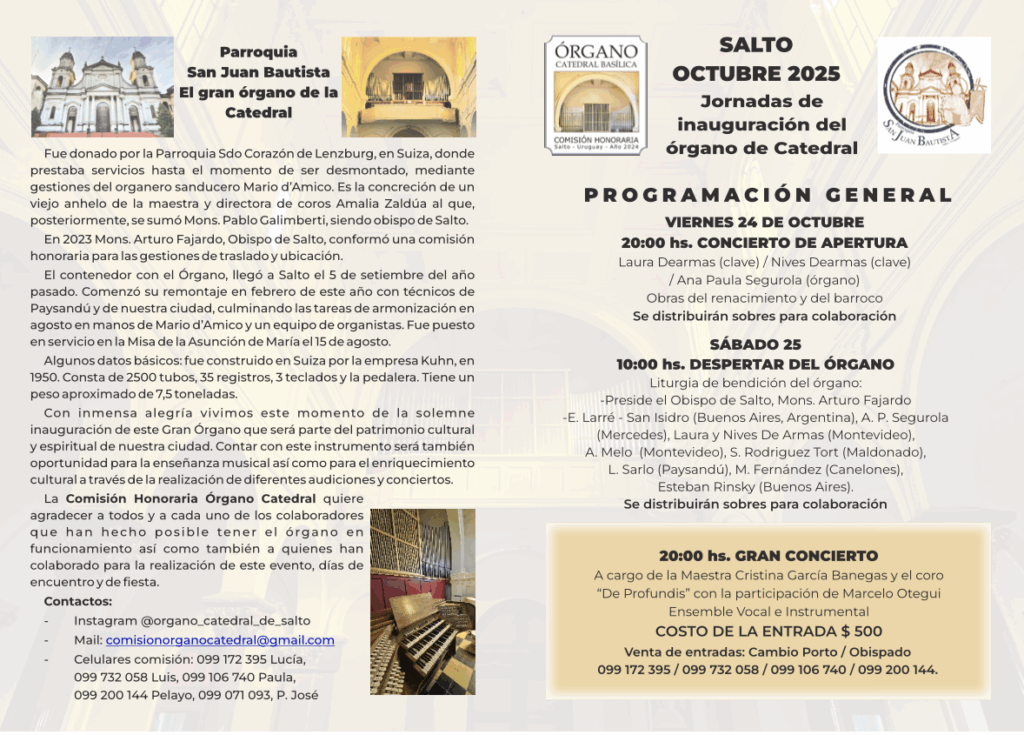 La Catedral Basílica San Juan Bautista será escenario de un evento musical excepcional el próximo viernes 25 de octubre, con el Concierto de Órgano “De Profundis”, dirigido por la destacada Maestra Cristina García Banegas, una de las figuras más reconocidas del órgano en América Latina.