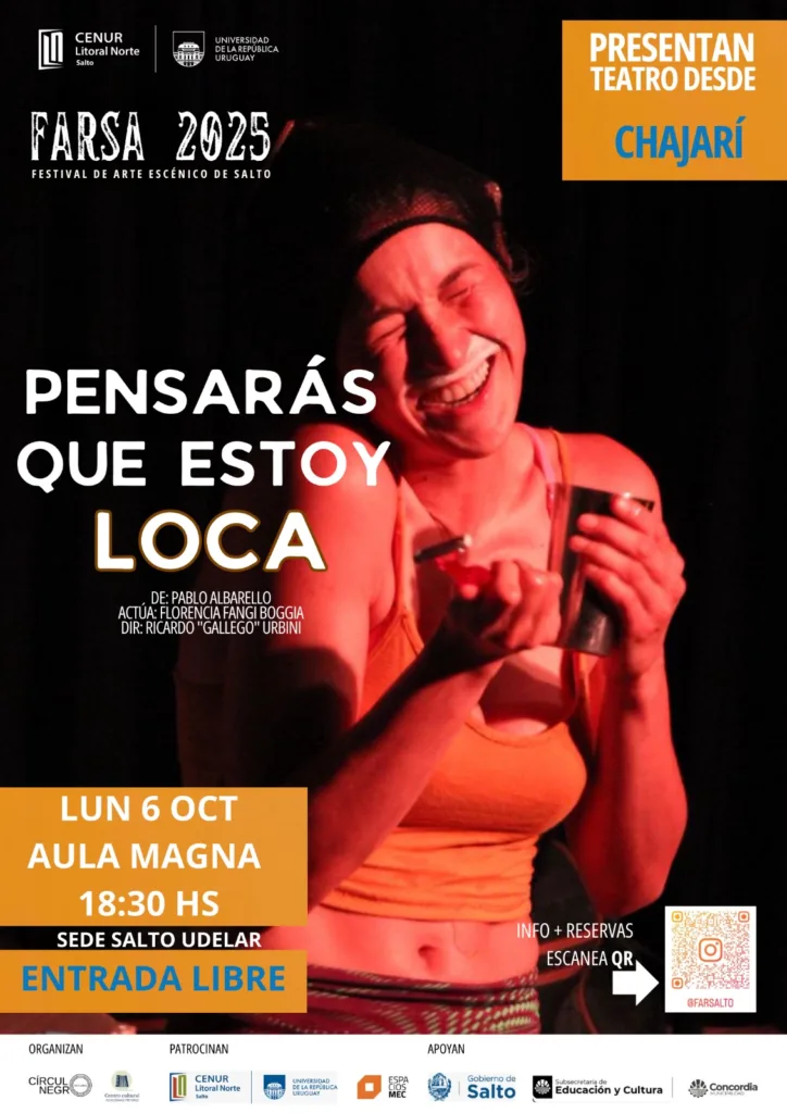 En el marco del Festival de Artes Escénicas de Salto (FARSA), el lunes 6 de octubre de 2025 a las 18:30 horas, se presentará en el Aula Magna de la sede Salto de la Udelar la obra argentina “Pensarás que estoy loca”, con entrada gratuita.