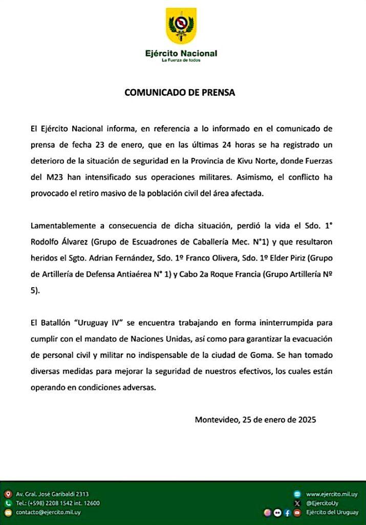 Este episodio refuerza el sacrificio y compromiso de los integrantes del Ejército Nacional que participan en misiones de paz, destacándose en escenarios complejos y poniendo en alto el nombre de Uruguay en la comunidad internacional.