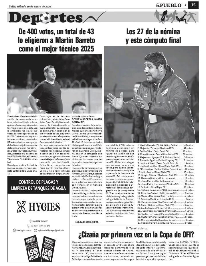 Tras la contabilización de 400 voluntades (ese fue el número máximo pretendido), resultó el DT de Ceibal, Martín Barreto, con el mayor número de votos. La diferencia en el registro con con respecto a quienes se situaron en posiciones inmediatas fue limitada, como en los casos de Héctor Alejandro Torrens (Nacional), Emilio Silva (Ferro Carril), Rony Costa (Gladiador) y Alejandro Irigoyen (Universitario). Pero lo cierto es que la primera colocación le cupo a Barreto, tras el primer año en la Dirección Técnica de Ceibal.