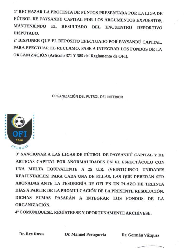 Como consecuencia de los hechos, la Liga de Fútbol de Paysandú elevó una nota-denuncia al Tribunal de OFI, reclamando incluso los puntos en juego. A su vez, desde Artigas no faltaron réplicas argumentales.