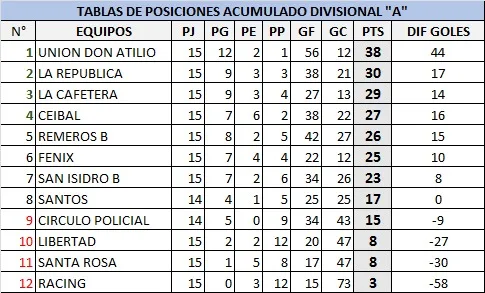 38 puntos de un líder y los 8 para la ventaja. Tras la nueva fecha que pasó en la Liga de Fútbol Súper Sénior, un mandamás que no decrece: es Unión Don Atilio, con 38 puntos y una diferencia de ocho puntos respecto a La República, que alcanza la segunda posición. Con Unión Don Atilio es comprobable, otra vez como tantas veces, el caudal goleador que no le falta: llega a 56 goles en 15 partidos, teniendo a su vez una de las defensas menos vencidas. La clasificación plantea. No hay discusión respecto a quién luce como favorito para ser el campeón.