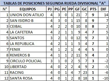 No solo que en la Liga de Fútbol Súper Sénior trasciende el acumulado, también la segunda rueda. En este caso, tratándose de la Divisional “A”, la vanguardia compartida con Unión Don Atilio y San Isidro B. Los 9 puntos en cada caso y con una derrota cada uno, mientras Ceibal es quien figura en la tercera posición. Al tiempo de los goles, Unión Don Atilio suma 21 goles en cuatro partidos jugados.