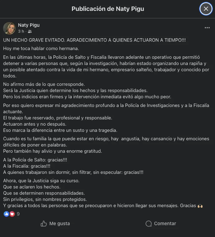 En su mensaje difundido este sábado, Pigurina explicó que la intervención permitió detener a varias personas que presuntamente estaban organizando una rapiña y un posible atentado contra la vida de su hermano, un empresario salteño muy conocido en el medio local.