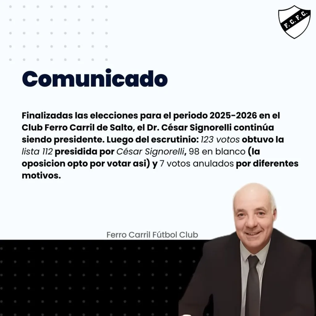 Al paso de las horas y una vez finalizado el conteo de votos, desde la Comisión Directiva de Ferro Carril se anunció en comunicado oficial el resultado de la contienda. A los efectos de transparentar la información, desde EL PUEBLO no hacemos menos que reproducir el contenido de referencia.
