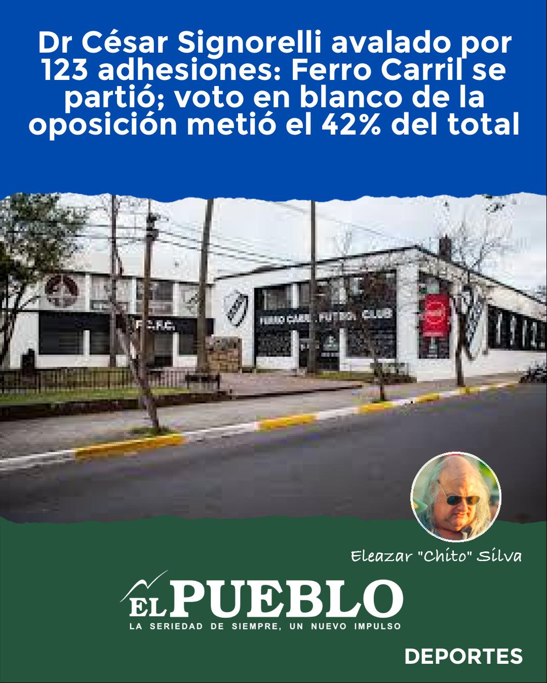 -Ferro Carril fue a las urnas ayer domingo en la mañana, con un tiempo de cuatro horas: de 9 a 13 horas. Tras el conteo, el anuncio, para patentar a manera de consecuencia la prolongación del Dr. César Signorelli en el ejercicio de la presidencia por un año más. La instancia supo de una característica especial, desde el momento que el viernes a la tarde, la lista opositora era notificada de un error administrativo que resultó clave para su anulación como alternativa. La lista 1912 encabezada por Rodrigo Rivas permanecería al margen de la contienda. Desde la Comisión Directiva de Ferro Carril se dijo sin más trámite a título informativo que de 30 firmas requeridas, se contabilizaron 29, por lo que ellos se configuró como razón suficiente para el rechazo de una nómina de socios que estaban dispuestos a combatir en las urnas la continuidad del actual presidente.