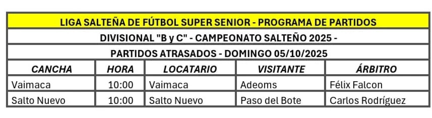 El fútbol de la Liga Súper Sénior se limitará hoy domingo a dos partidos. Se trata de encuentros atrasados, ambos a jugarse desde la hora 10, enmarcados en la Divisional “B” y “C”. A este apunte, hay que tenerlo en cuenta.