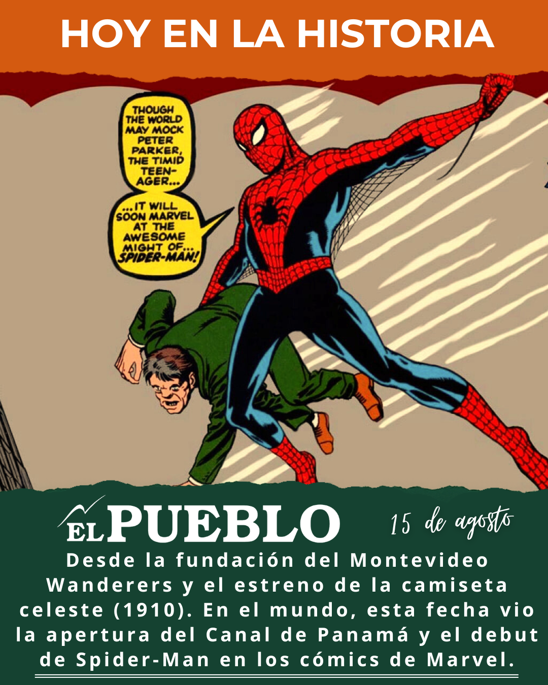- 1962: Nacimiento de Spider-Man en los cómics. Marvel Comics publica en Estados Unidos el número 15 de Amazing Fantasy, historieta en la que debuta Spider-Man (el Hombre Araña) creado por Stan Lee y Steve Ditko. La primera aparición del famoso superhéroe adolescente marcó un hito en la cultura pop y el inicio de uno de los personajes más emblemáticos del cómic a nivel mundial.