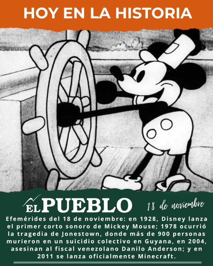 - 1928: Walt Disney estrena Steamboat Willie, el primer cortometraje animado de Mickey Mouse con sonido sincronizado, marcando un antes y un después en la historia de la animación.