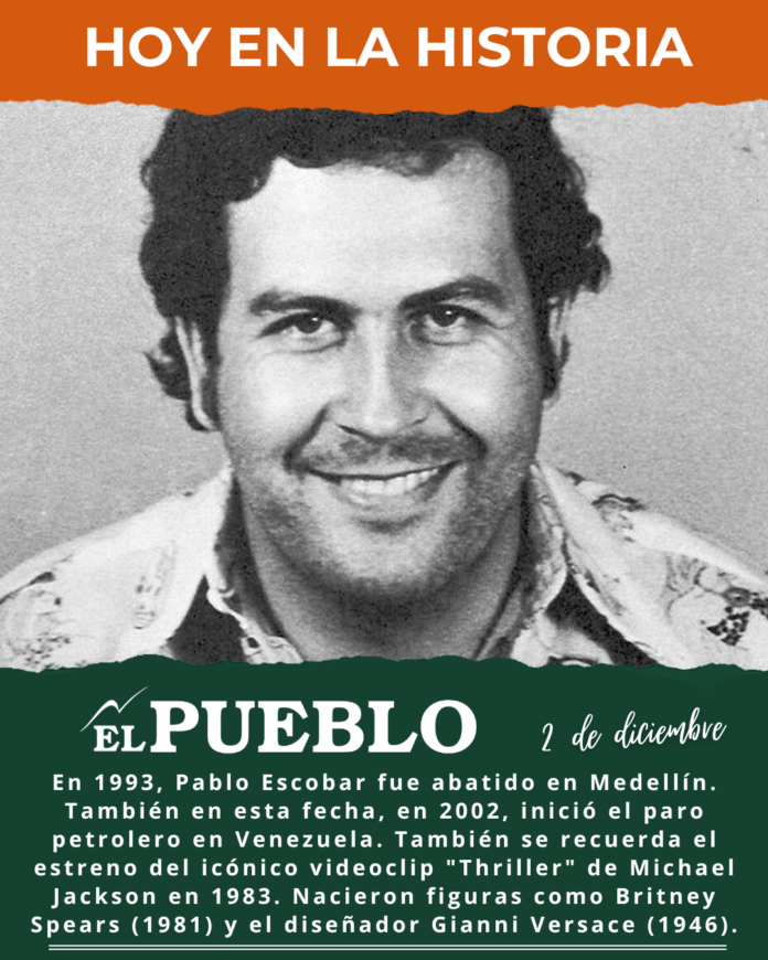- 1993: En Medellín, Colombia, unidades especiales de la policía localizan y abaten al capo narcotraficante Pablo Escobar, líder del cártel de Medellín, tras meses de intensa búsqueda. Su muerte simbolizó el comienzo del fin de la era de los grandes cárteles de la droga en Colombia.