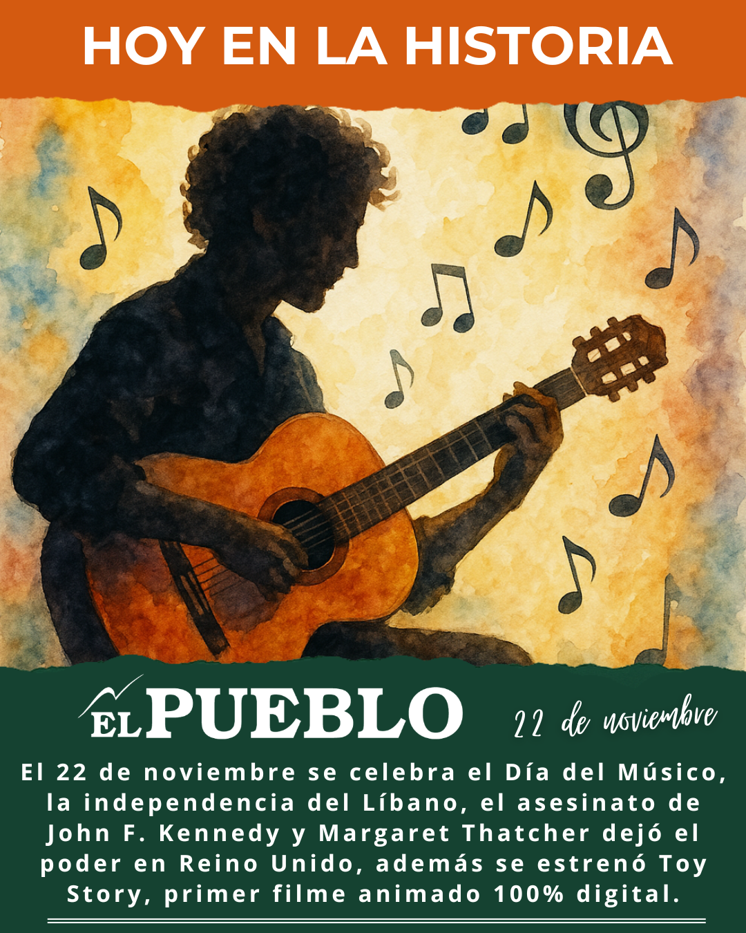 - Celebración Cultural — Día del Músico: Se celebra tradicionalmente en Uruguay (y en gran parte de Occidente) el día de Santa Cecilia, patrona de la música. Es una fecha de alta relevancia cultural con conciertos de bandas municipales, orquestas sinfónicas y coros en todo el territorio nacional.