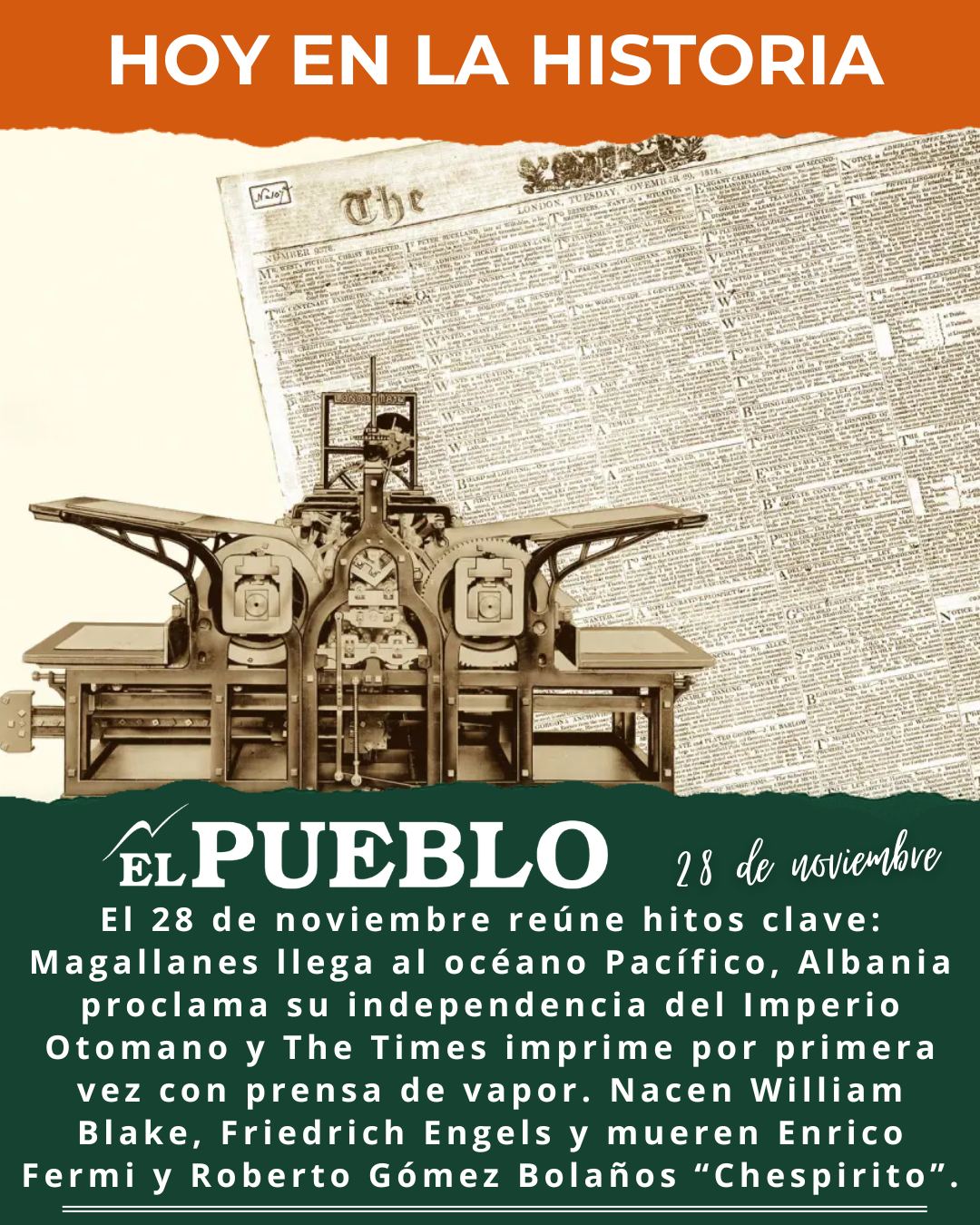 - 1814: * (1) En Londres, el periódico The Times se convierte en el primero del mundo impreso con una prensa de vapor, tecnología revolucionaria que aceleró la producción de diarios y anticipó la prensa industrial moderna.