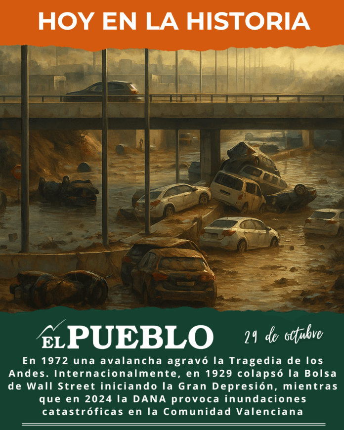 - 1929: En Nueva York se desploma la Bolsa de Wall Street en el llamado Martes Negro, evento que desencadena la Gran Depresión económica mundial de los años treinta.