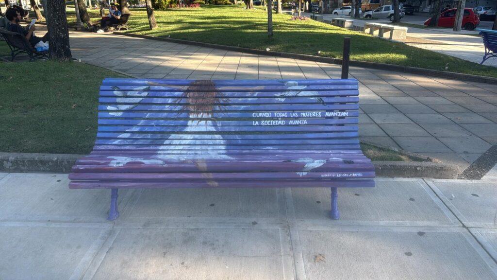 Los bancos fueron pintados de color violeta, símbolo del movimiento por los derechos de las mujeres, y llevan inscrita la frase “Cuando todas las mujeres avanzan, la sociedad avanza”, una elección personal de la intendenta Ingrid Urroz. “Estos bancos no son solo para sentarse, sino para ser apreciados y reflexionar sobre el rol de la mujer en la sociedad”, expresó Urroz durante la actividad.