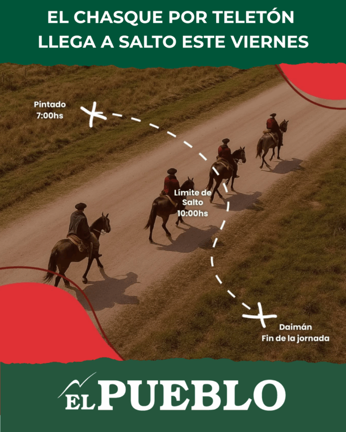 Este viernes 31 de octubre, la cabalgata del Chasque por Teletón arribará al departamento de Salto como parte de una extensa travesía a caballo que, durante doce días, recorre los 19 departamentos del país con el apoyo de más de cien aparcerías y la organización de Marcheros de América. La propuesta busca transmitir un mensaje de unidad y recordar que la rehabilitación de miles de niños y adolescentes no puede detenerse.