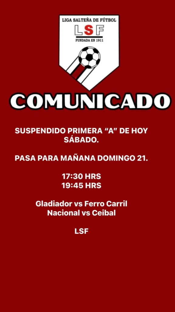 La Liga Salteña de Fútbol (LSF) informa a los clubes, socios y público en general que la jornada de Primera «A» prevista para el día de hoy, sábado 20 de diciembre, ha sido oficialmente suspendida.