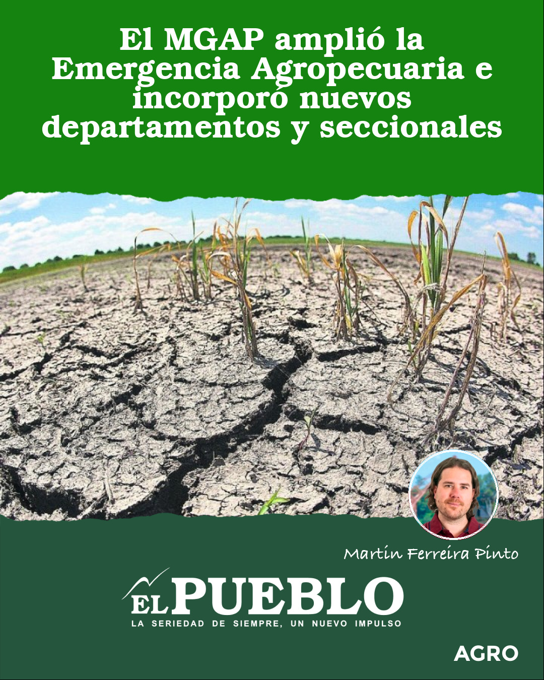 El Ministerio de Ganadería, Agricultura y Pesca resolvió ampliar la Declaración de Emergencia Agropecuaria por déficit hídrico, extendiendo el alcance de la medida a nuevos departamentos y seccionales policiales del país.