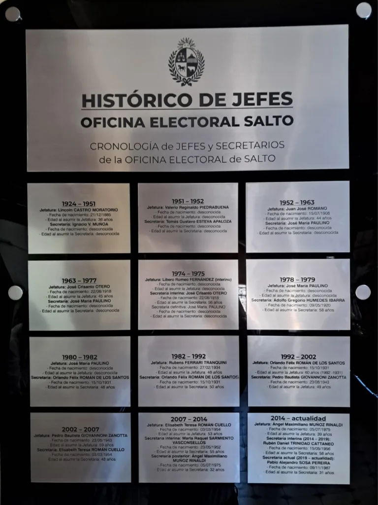 Desde su creación en 1924, la Oficina Electoral de Salto ha sido una de las dependencias más estables del país. Solo doce personas han ocupado la jefatura y trece la secretaría en más de un siglo, con gestiones que promedian los nueve años de duración.