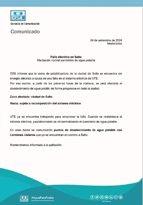 Recordamos que en el día de la fecha OSE emitió un comunicado debido a que un corte de luz en la planta potabilizadora de Salto no permitia el normal abastecimiento de agua potable a la población.