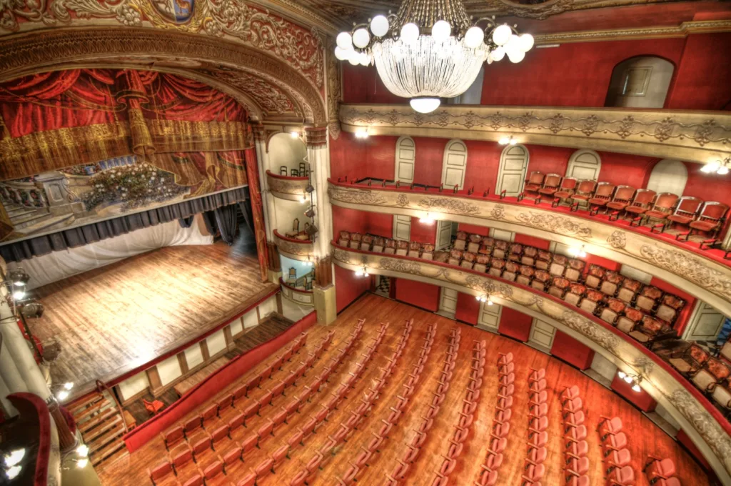 En su interior se destacan las paredes empapeladas, el cielo raso y el telón original, obras de reconocidos artistas que conservan intacto su esplendor.