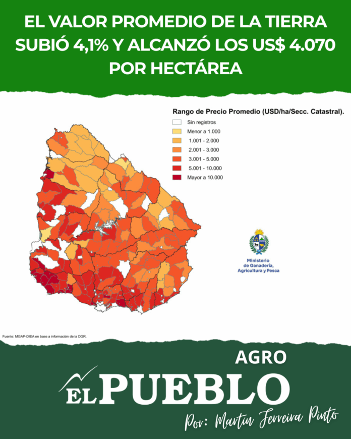 En el extremo opuesto, los valores más bajos se observaron en Artigas (US$ 1.910/ha) y Tacuarembó (US$ 2.360/ha), departamentos donde predomina la actividad ganadera extensiva sobre suelos de menor productividad.