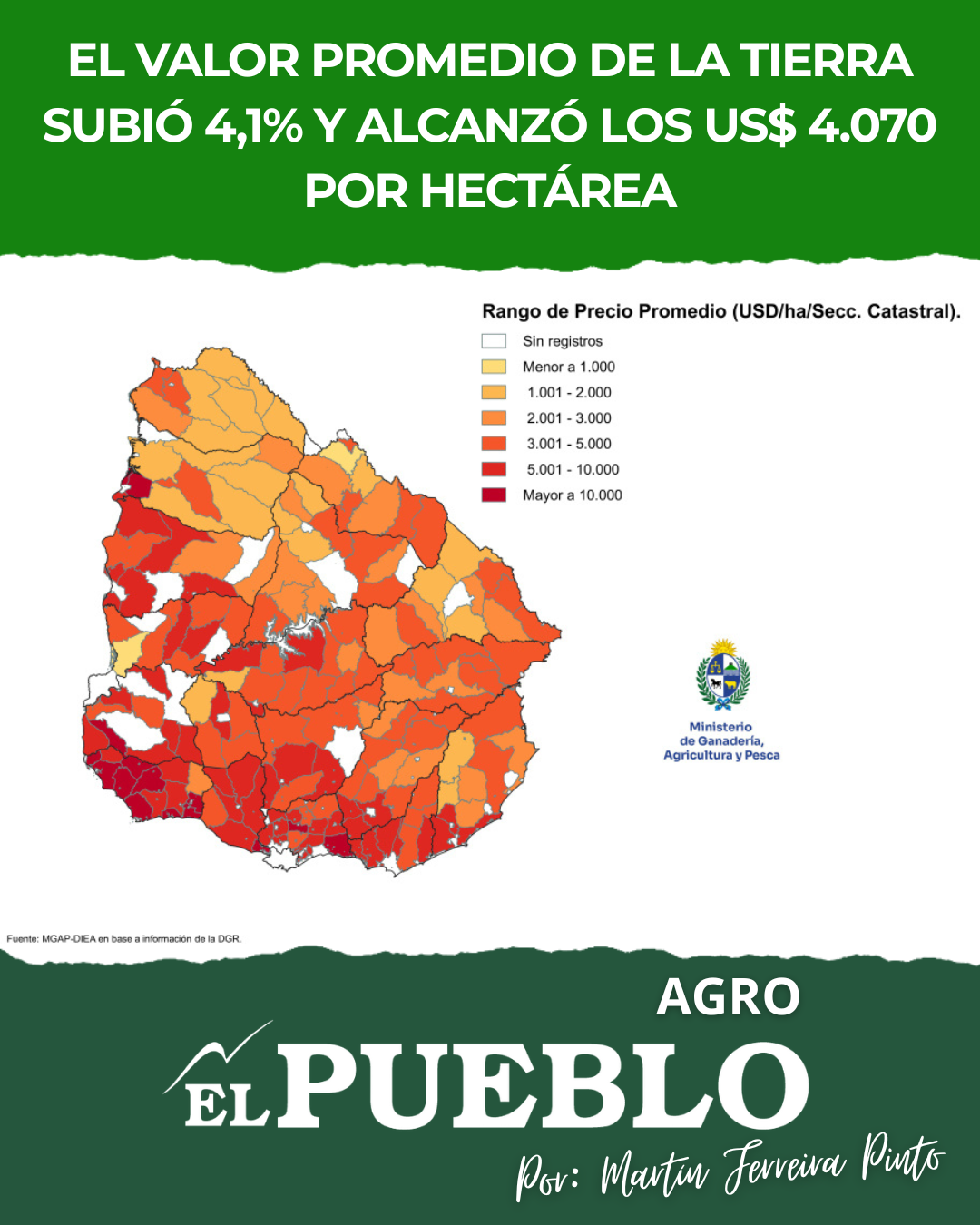 Colonia: US$ 10.337 por hectárea; Soriano: US$ 8.696 por hectárea y San José: US$ 7.335 por hectárea.