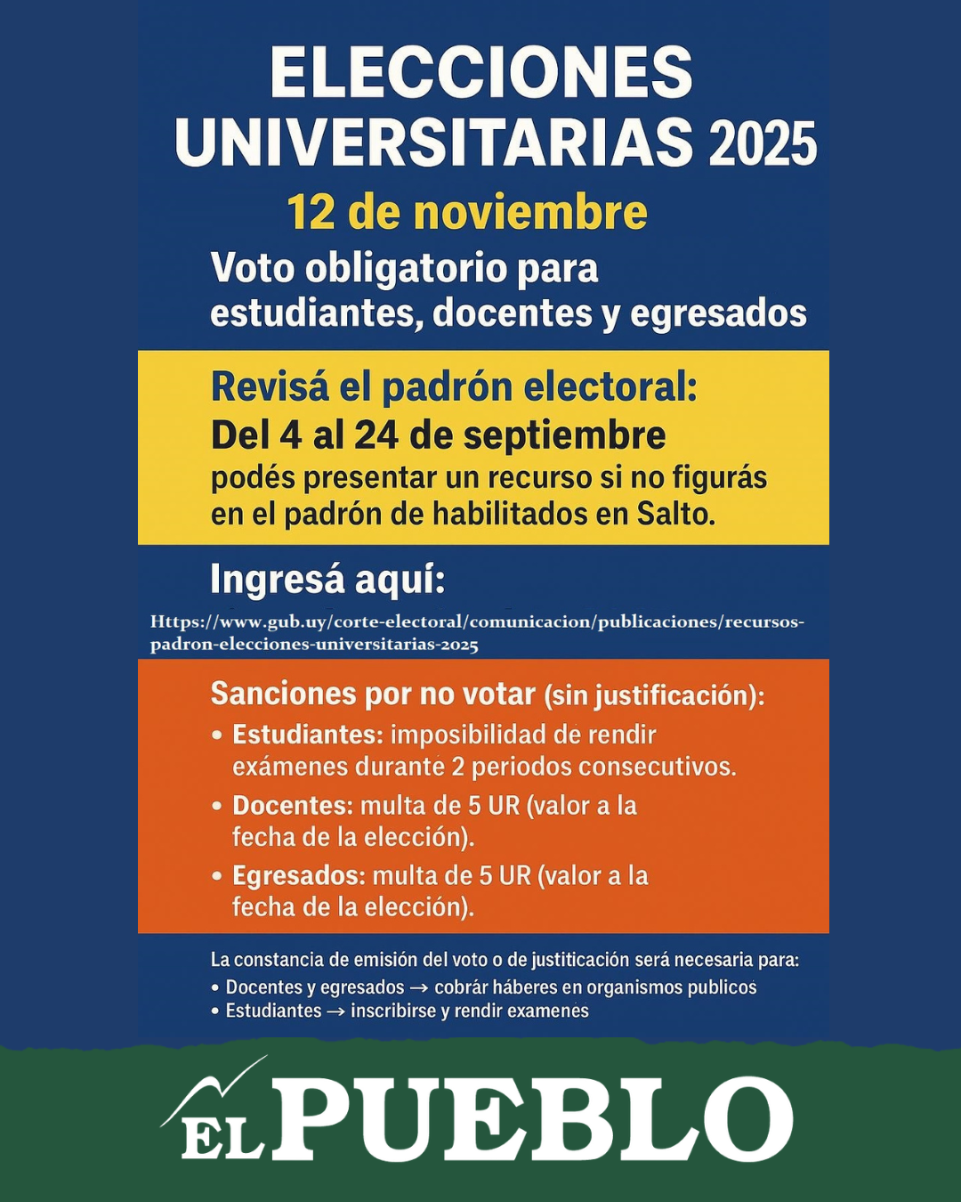 La Oficina Electoral de Salto recuerda que estudiantes, docentes y egresados deberán votar el 12 de noviembre, con sanciones previstas para quienes no cumplan.