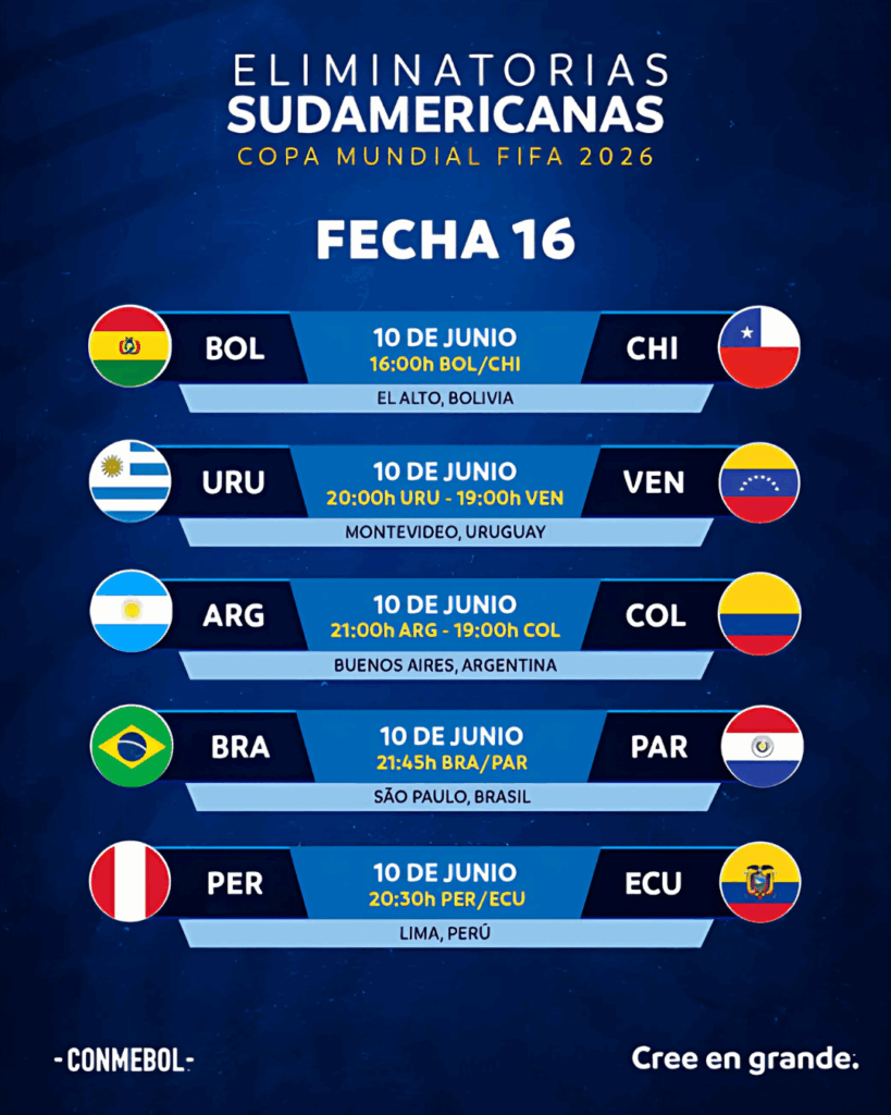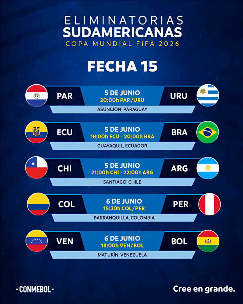 La Confederación Sudamericana de Fútbol (Conmebol) confirmó este viernes los detalles de las fechas 15 y 16 de las Eliminatorias rumbo al Mundial 2026, que se disputará en Estados Unidos, México y Canadá.