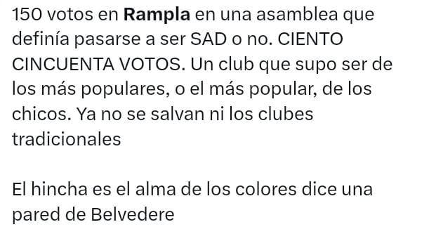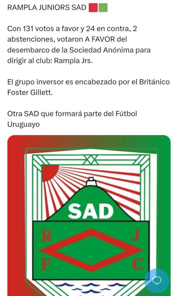 Sin embargo, inmerso en una aguda crisis económica, Rampla Juniors decidió pasar a ser una Sociedad Anónima Deportiva (SAD). Esta determinación fue avalada por solo 150 socios.