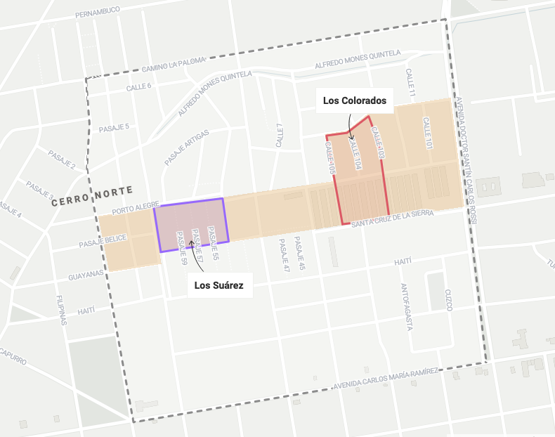 Los Colo y Los Suárez son los principales grupos narco que operan en Cerro Norte, disputándose el control del territorio y la venta de drogas. La violencia entre ambos ha dejado varias muertes en la zona, especialmente en un área delimitada por las calles Santa Cruz de la Sierra, Porto Alegre, Puerto Rico y Santín Carlos Rossi.