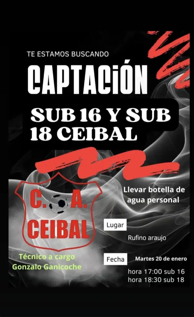 Del llamado a los socios, al desarrollo de la asamblea anual en el Club Atlético Ceibal, para que en la noche del pasado viernes la decisión fuese básica: en Elio Rodríguez, el electo nuevo presidente con la mira en el período. El hecho es que en Ceibal, «no sólo queremos apuntar al plantel de Primera División. Nos importa remover las divisiones juveniles y de a poco, generar el nivel y protagonismo que Ceibal resignó en los últimos tiempos» En razón de ese objetivo, hoy martes 20 de enero es el día marcado para que la captación de nuevos jugadores no falte, tanto en la categoría Sub 16 como Sub 18, con la Dirección Técnica de Gonzalo Ganicoche. La información apuntada a EL PUEBLO y la invitación concreta, mientras rige una pretensión: «que se pongan la camiseta de Ceibal»