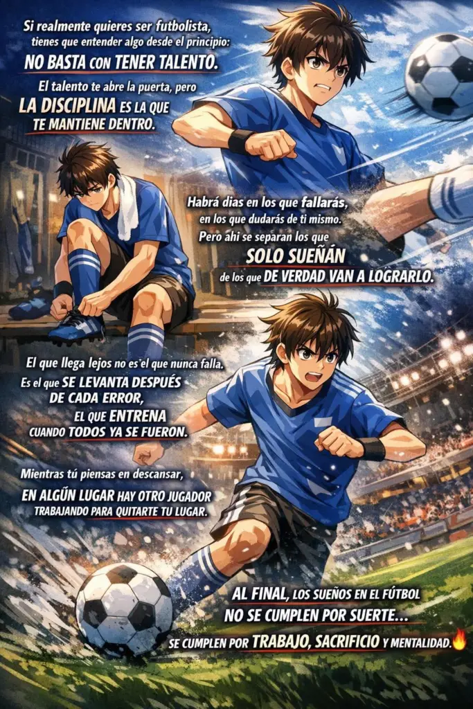 Habrá días en los que no tendrás ganas de entrenar, días en los que fallarás goles fáciles, días en los que sentirás que otros jugadores avanzan más rápido que tú. Pero ahí es donde se separan los que solo sueñan de los que de verdad van a lograrlo. El jugador que llega lejos no es el que nunca falla. Es el que se levanta después de cada error, el que se queda entrenando cuando todos ya se fueron, el que escucha críticas y las convierte en combustible.